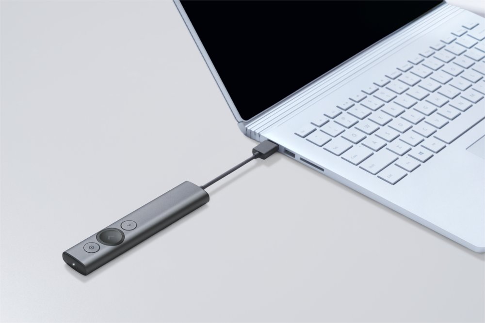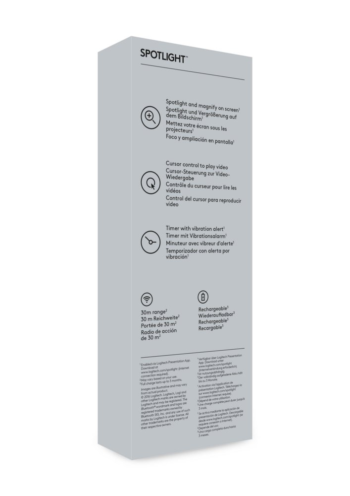 Spotlight brengt onmiddellijk een verbinding tot stand via een USB-ontvanger of Bluetooth® Smart. Spotlight is plug-and-play op de meeste platforms en compatibe met alle populaire presentatie-apps. Bovendien is het apparaat volledig oplaadbaar en heeft het een werkingsbereik van 30 meter.